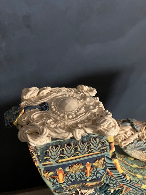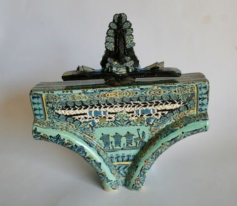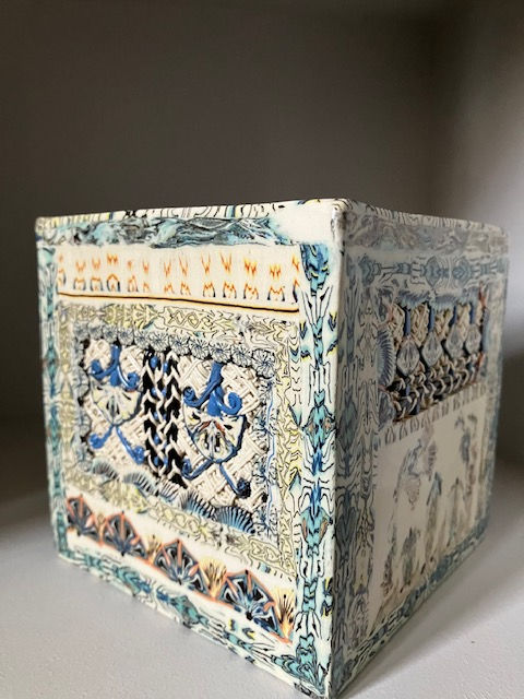 L’argile est coloré dans la masse, puis découpée en lanières, en petites plaques, cubes ou fils ténus, qui seront incorporés et assemblés les uns aux autres, à l’instar de ce qui est pratiqué pour la mosaïque ou la marqueterie. Le graphisme alors puise sa source dans la matière même pour faire corps avec elle.